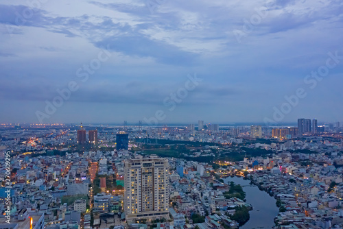 Naklejka premium High Density Suburban area at Twilight Aerial of SE Asian City