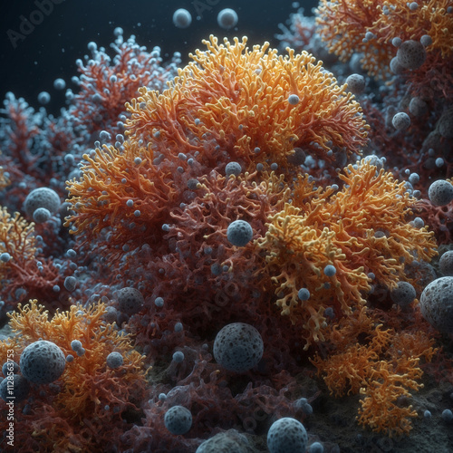 © faisal, Fototapeta premium High-detail microorganisms, bacteria and fungi in biofilm clusters, soft realistic textures, dynamic interaction scene