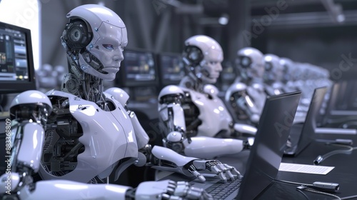 © Manroy, Fototapeta premium High efficiency with robots working on laptops