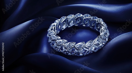 Fototapeta premium High-end diamond bracelet resting under a cool spotlight on a soft navy satin cloth