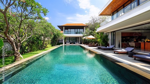 Fototapeta premium High-end minimalist house with large swimming pool, sleek lines, clean landscape design