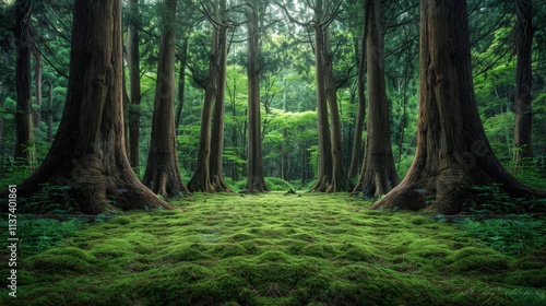 © Nosheen, Obraz premium High-end photography of a dense, ancient forest with towering trees and a carpet of moss