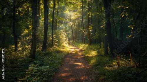 Fototapeta premium High-end photography of a secluded forest trail with dappled sunlight filtering through the trees
