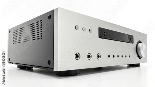 © ศาศวัต ธีรเศรษฐบดี, Fototapeta premium High-end silver stereo amplifier receiver with multiple input ports, volume knob, and display screen, ideal for home audio systems.