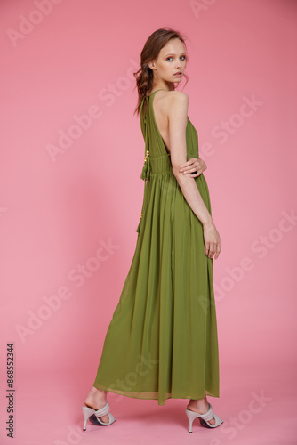 Fototapeta premium High fashion photo of a beautiful elegant young skinny woman in pretty long green dress posing on pink background. Slim figure.