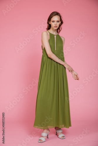 Fototapeta premium High fashion photo of a beautiful elegant young skinny woman in pretty long green dress posing on pink background. Slim figure.