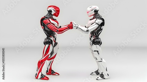 © Surachate, Obraz premium High-Five Encounter, A playful 3D robot enthusiastically engaging with another robot in a friendly high-five gesture, showcasing camaraderie and fun.