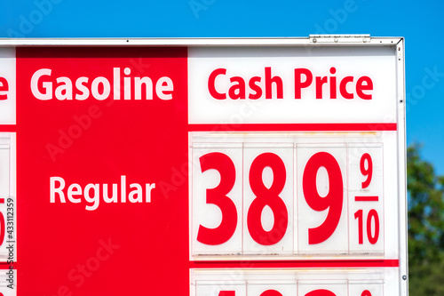 Fototapeta premium High gas prices on red sign. Cash price for regular gasoline