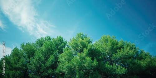 © DigitalDruid, Obraz premium High green pine forest canopy under clear blue sky, suitable for environmental or seasonal design