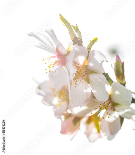 Obraz premium High key image of almond blossoms, with pistils in focus and the rest of the...
