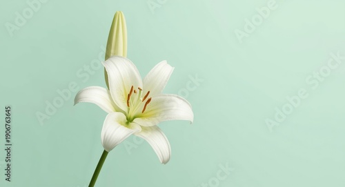 Fototapeta premium High key pastel mint background showing isolated lilly and copy space