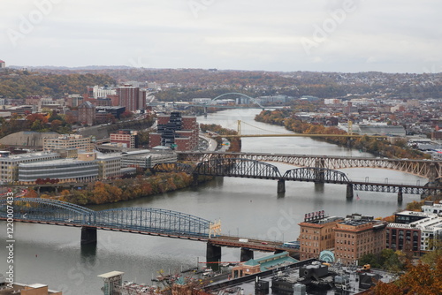 Obraz premium High level view of the city skyline from the river in downtown Pittsburgh,...