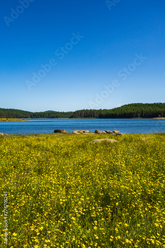 © Petar, Fototapeta premium High mountain lake during summer time, Green meadow with beautiful yellow flowers in front.