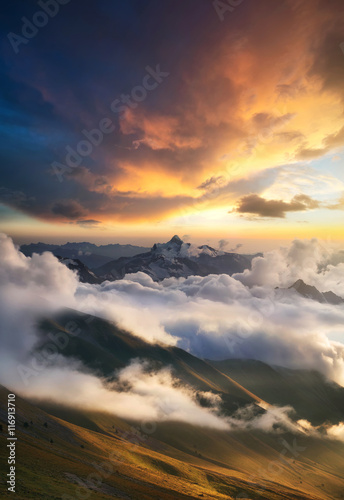 © biletskiyevgeniy, Obraz premium High mountain ridge in the clouds during sunrise. Beautiful panoramic landscape