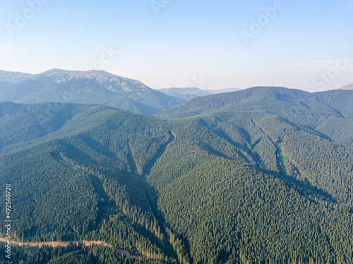 Naklejka premium High mountains of the Ukrainian Carpathians in sunny weather. Aerial drone view.
