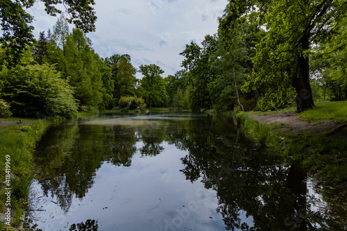 Fototapeta premium High old trees and bushes around small pond with reflection in water