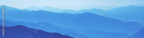 Fototapeta premium High peaks of beautiful blue mountain range landscape with fog and forest. Ukraine, Carpathians. Horizontal image.