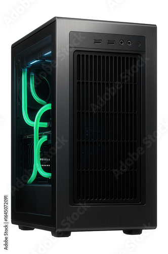 © OMD, Fototapeta premium High-performance desktop tower with liquid cooling tubes visible through the side window