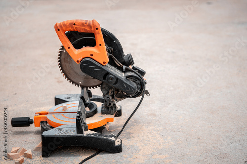 © NiK0StudeO, Obraz premium High precision adjustable wood cutting angle electric circular saw is widely used nowadays.