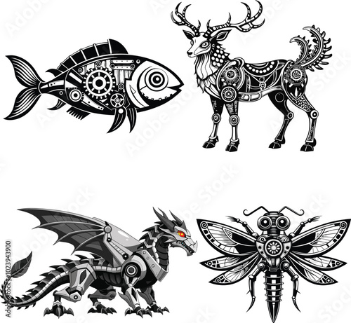 Obraz premium High-Quality Black and White Animal Silhouettes and Steampunk Mechanical Creatures Vector Collection