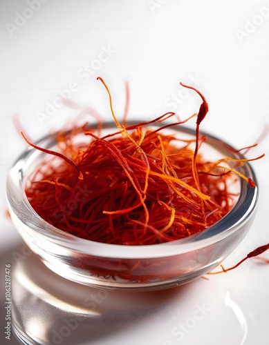 © Julia, Fototapeta premium High-quality close-up of saffron threads on a plain white background