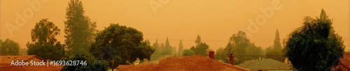 © Ryzhkov, Naklejka premium High-Quality Emergency Air Quality Crisis Smoke Haze Over Neighborhood Modern Environmental Threat Impact for Disaster Preparedness Marketing and Social Media