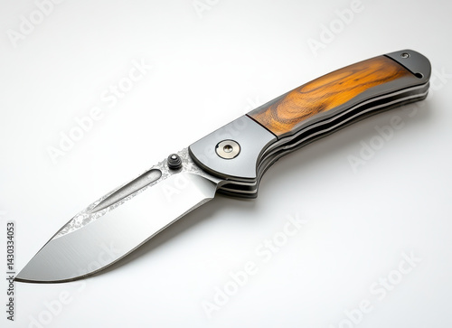 © Bartek, Obraz premium High-quality hyper-realistic image of open folding knife with wooden handle isolated on pure white background
