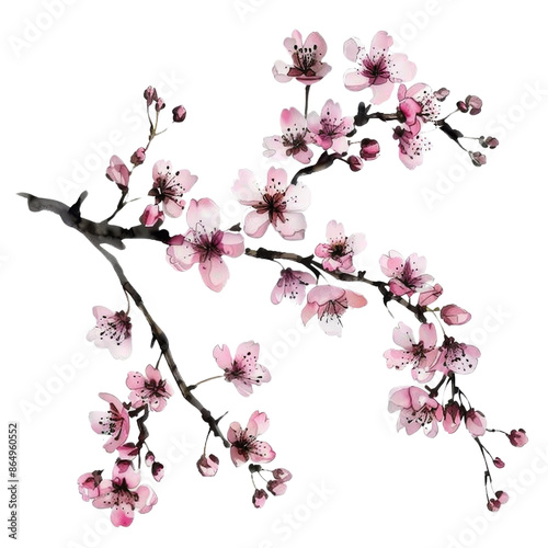 © pingpao, Naklejka premium High-quality illustration of a cherry blossom branch with delicate pink flowers in full bloom, perfect for seasonal and floral design themes. Isolated on transparent background.