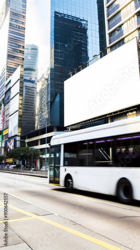 © Kevin, Naklejka premium high-quality image featuring an empty poster mockup on the side of a moving bus.