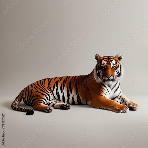 © Asso, Fototapeta premium High-quality 4K wallpaper of a graceful tiger lounging calmly with striking orange and black stripes, set against a soft gray minimalist background with elegant details.