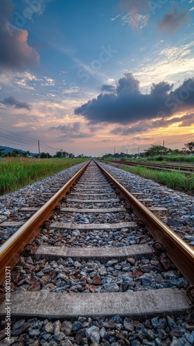 Fototapeta premium High quality photo of long train tracks leading towards a dramatic sunset sky...