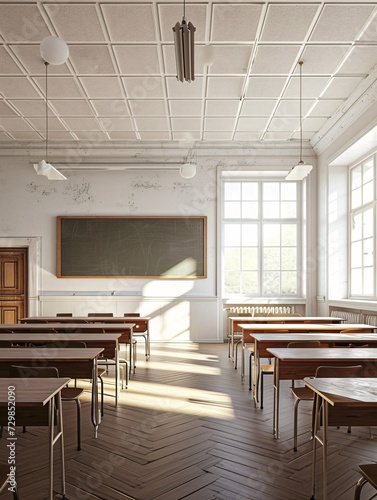 © ckybe, Naklejka premium High-quality photography studio setup with desks in interior classroom setting.