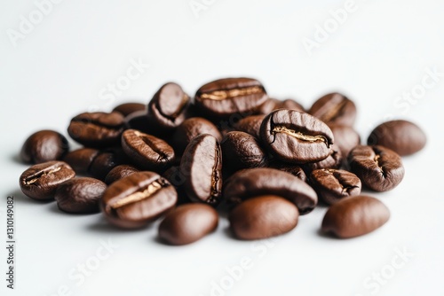 © Nyxoria, Naklejka premium High-quality roasted coffee beans arranged on a white surface for brewing and tasting
