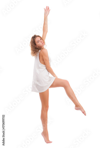 © oshepkov, Obraz premium High-ranking tall girl in a white T-shirt on a white background