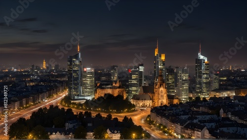 © Mudassir, Obraz premium High resolution aerial panoramic view of Frankfurt, Germany after sunset.