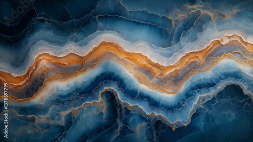 © Wilker, Fototapeta premium High-resolution close-up image depicting an abstract pattern featuring swirling lines and shapes. Predominantly blue hues are accented with streaks and bands of orange and white. The texture mimics