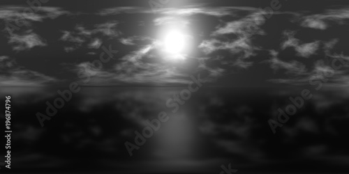 © dottedyeti, Fototapeta premium high resolution HDRI map: environment map for equirectangular projection, spherical panorama, 3d illustration background (black and white night sky with bright moon and fluffy clouds over calm ocean)