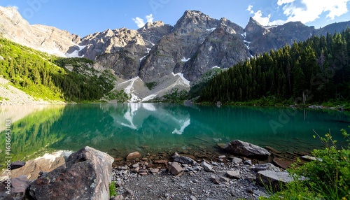 Naklejka premium High-resolution image of a crystal-clear alpine lake reflecting majestic...