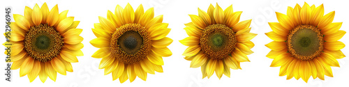© Purichaya, Fototapeta premium High-resolution image of four vibrant, fully-bloomed sunflowers side by side with a white background, perfect for summer-themed designs.
