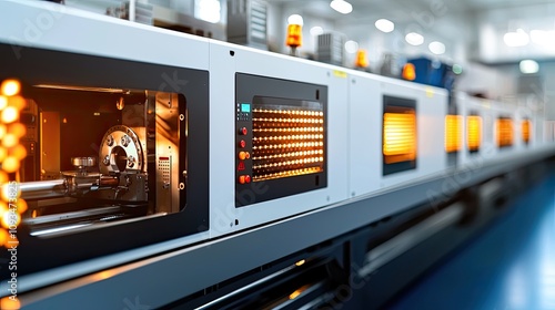 © Sumet, Obraz premium High-Resolution Image of Modern Industrial Machinery with Illuminated Control Panel in a Factory Setting, Showcasing Advanced Manufacturing Process and Technology