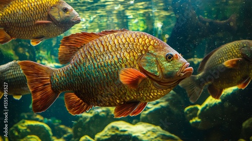© Paul, Fototapeta premium High-resolution image of red tilapia gathering near a feeding point, vibrant scales glistening under sunlight in a freshwater pond
