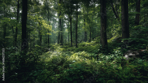 Obraz premium High-resolution lush summer forest images: vibrant green trees, dense...