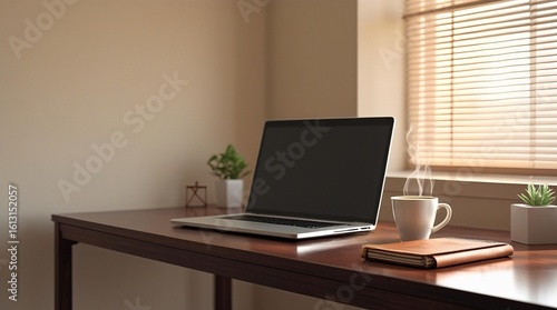 Obraz premium High-Resolution Photograph of Modern Office Workspace with Laptop, Coffee, and Notebook