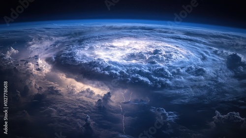 Fototapeta premium High-resolution satellite photograph of a storm system with intricate cloud formations and active lightning, capturing its size