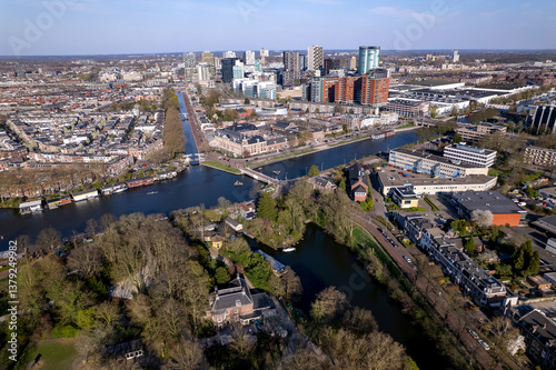 © Maarten Zeehandelaar, Fototapeta premium High rise buildings of financial office district and urban transportation hub seen from above with draw bridge in the froeground. Aerial airscape cityscape Utrecht, The Netherlands