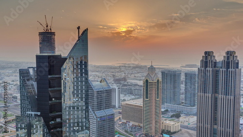 Fototapeta premium High-rise buildings on Sheikh Zayed Road in Dubai aerial timelapse during sunset, UAE.