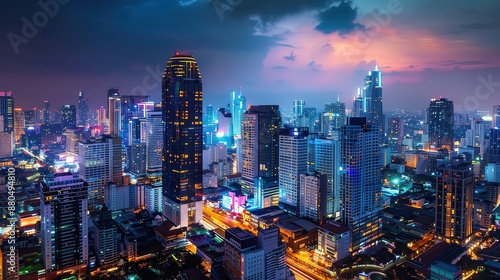 © Premreuthai, Fototapeta premium High-rise skyscraper in a bustling city center, illuminated at night with a vibrant skyline