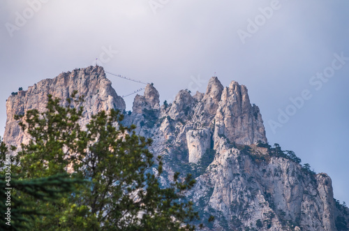 © Dmitrii Potashkin, Naklejka premium High rocky mountains with forested slopes and peaks hidden in the clouds. Ai-Petri, Crimea