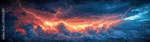 © Naput, Naklejka premium High-saturation zigzag lightning bolts against a stormy sky, detailed clouds, and dramatic light effects