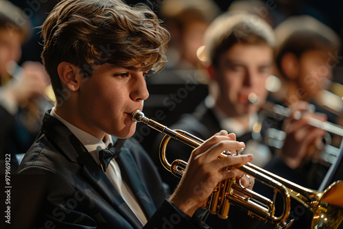 © Abhiraj, Fototapeta premium High School Student Mastering the Trumpet in Orchestra – A Showcase of Musical Passion"